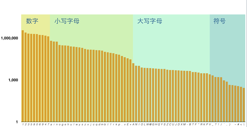 我不是黑客,不知破解算法是怎么做的,但只要键入一个字,就让你的密码与众不同,你会怎么敲? 我们对密码里用到的所有字进行统计,得出下图